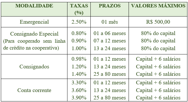 Quando o associado solicita um empréstimo, ele deve informar o valor desejado e o número de parcelas com o qual pretende quitar o montante. O valor a ser descontado mensalmente é analisado pela empresa responsável pela consignação, que brevemente, informa à Cooperativa a margem disponível do funcionário, autorizando ou não o desconto em folha de pagamento, dependendo da margem.