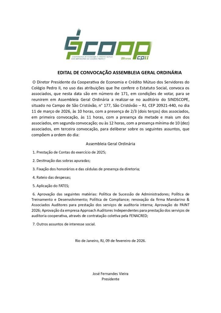 CONVOCAMOS TODO O QUADRO SOCIAL PARA PARTICIPAR DA AGO 2026 DA COOPCP II, QUE SERÁ REALIZADA NO DIA 11/03/2026, CONFORME EDITAL ABAIXO. DISPONIBILIZAMOS TAMBÉM O EDITAL PARA DOWNLOAD A SEGUIR: (CLIQUE AQUI).